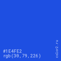 Цвет #1E4FE2 в цветовой модели RGB обозначается тремя октетами (30, 79, 226) в десятичном формате и #1E4FE2 в шестнадцатиричном (hex) формате, которые являются интенсивностью красного 30 (hex 1E), интенсивность зелёного 79 (hex 4F) и интенсивность синего 226 (hex E2).