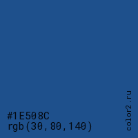 Цвет #1E508C в цветовой модели RGB обозначается тремя октетами (30, 80, 140) в десятичном формате и #1E508C в шестнадцатиричном (hex) формате, которые являются интенсивностью красного 30 (hex 1E), интенсивность зелёного 80 (hex 50) и интенсивность синего 140 (hex 8C).