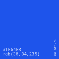 Цвет #1E54EB в цветовой модели RGB обозначается тремя октетами (30, 84, 235) в десятичном формате и #1E54EB в шестнадцатиричном (hex) формате, которые являются интенсивностью красного 30 (hex 1E), интенсивность зелёного 84 (hex 54) и интенсивность синего 235 (hex EB).