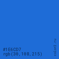 Цвет #1E6CD7 в цветовой модели RGB обозначается тремя октетами (30, 108, 215) в десятичном формате и #1E6CD7 в шестнадцатиричном (hex) формате, которые являются интенсивностью красного 30 (hex 1E), интенсивность зелёного 108 (hex 6C) и интенсивность синего 215 (hex D7).