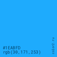 Цвет #1EABFD в цветовой модели RGB обозначается тремя октетами (30, 171, 253) в десятичном формате и #1EABFD в шестнадцатиричном (hex) формате, которые являются интенсивностью красного 30 (hex 1E), интенсивность зелёного 171 (hex AB) и интенсивность синего 253 (hex FD).