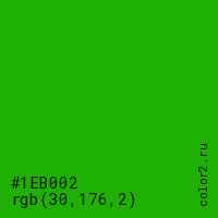 Цвет #1EB002 в цветовой модели RGB обозначается тремя октетами (30, 176, 2) в десятичном формате и #1EB002 в шестнадцатиричном (hex) формате, которые являются интенсивностью красного 30 (hex 1E), интенсивность зелёного 176 (hex B0) и интенсивность синего 2 (hex 02).