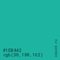 Цвет #1EB4A2 в цветовой модели RGB обозначается тремя октетами (30, 180, 162) в десятичном формате и #1EB4A2 в шестнадцатиричном (hex) формате, которые являются интенсивностью красного 30 (hex 1E), интенсивность зелёного 180 (hex B4) и интенсивность синего 162 (hex A2).
