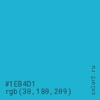 Цвет #1EB4D1 в цветовой модели RGB обозначается тремя октетами (30, 180, 209) в десятичном формате и #1EB4D1 в шестнадцатиричном (hex) формате, которые являются интенсивностью красного 30 (hex 1E), интенсивность зелёного 180 (hex B4) и интенсивность синего 209 (hex D1).