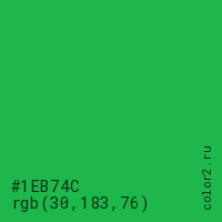 Цвет #1EB74C в цветовой модели RGB обозначается тремя октетами (30, 183, 76) в десятичном формате и #1EB74C в шестнадцатиричном (hex) формате, которые являются интенсивностью красного 30 (hex 1E), интенсивность зелёного 183 (hex B7) и интенсивность синего 76 (hex 4C).
