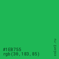 Цвет #1EB755 в цветовой модели RGB обозначается тремя октетами (30, 183, 85) в десятичном формате и #1EB755 в шестнадцатиричном (hex) формате, которые являются интенсивностью красного 30 (hex 1E), интенсивность зелёного 183 (hex B7) и интенсивность синего 85 (hex 55).