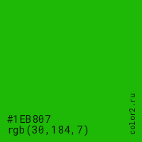 Цвет #1EB807 в цветовой модели RGB обозначается тремя октетами (30, 184, 7) в десятичном формате и #1EB807 в шестнадцатиричном (hex) формате, которые являются интенсивностью красного 30 (hex 1E), интенсивность зелёного 184 (hex B8) и интенсивность синего 7 (hex 07).
