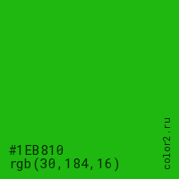 Цвет #1EB810 в цветовой модели RGB обозначается тремя октетами (30, 184, 16) в десятичном формате и #1EB810 в шестнадцатиричном (hex) формате, которые являются интенсивностью красного 30 (hex 1E), интенсивность зелёного 184 (hex B8) и интенсивность синего 16 (hex 10).