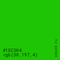 Цвет #1EC504 в цветовой модели RGB обозначается тремя октетами (30, 197, 4) в десятичном формате и #1EC504 в шестнадцатиричном (hex) формате, которые являются интенсивностью красного 30 (hex 1E), интенсивность зелёного 197 (hex C5) и интенсивность синего 4 (hex 04).