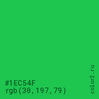 Цвет #1EC54F в цветовой модели RGB обозначается тремя октетами (30, 197, 79) в десятичном формате и #1EC54F в шестнадцатиричном (hex) формате, которые являются интенсивностью красного 30 (hex 1E), интенсивность зелёного 197 (hex C5) и интенсивность синего 79 (hex 4F).