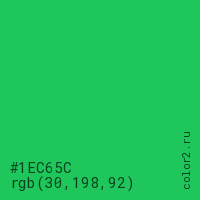 Цвет #1EC65C в цветовой модели RGB обозначается тремя октетами (30, 198, 92) в десятичном формате и #1EC65C в шестнадцатиричном (hex) формате, которые являются интенсивностью красного 30 (hex 1E), интенсивность зелёного 198 (hex C6) и интенсивность синего 92 (hex 5C).