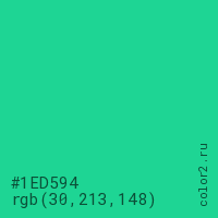 Цвет #1ED594 в цветовой модели RGB обозначается тремя октетами (30, 213, 148) в десятичном формате и #1ED594 в шестнадцатиричном (hex) формате, которые являются интенсивностью красного 30 (hex 1E), интенсивность зелёного 213 (hex D5) и интенсивность синего 148 (hex 94).