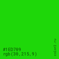 Цвет #1ED709 в цветовой модели RGB обозначается тремя октетами (30, 215, 9) в десятичном формате и #1ED709 в шестнадцатиричном (hex) формате, которые являются интенсивностью красного 30 (hex 1E), интенсивность зелёного 215 (hex D7) и интенсивность синего 9 (hex 09).