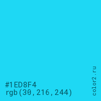 Цвет #1ED8F4 в цветовой модели RGB обозначается тремя октетами (30, 216, 244) в десятичном формате и #1ED8F4 в шестнадцатиричном (hex) формате, которые являются интенсивностью красного 30 (hex 1E), интенсивность зелёного 216 (hex D8) и интенсивность синего 244 (hex F4).