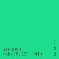Цвет #1EDD8D в цветовой модели RGB обозначается тремя октетами (30, 221, 141) в десятичном формате и #1EDD8D в шестнадцатиричном (hex) формате, которые являются интенсивностью красного 30 (hex 1E), интенсивность зелёного 221 (hex DD) и интенсивность синего 141 (hex 8D).