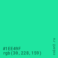Цвет #1EE49F в цветовой модели RGB обозначается тремя октетами (30, 228, 159) в десятичном формате и #1EE49F в шестнадцатиричном (hex) формате, которые являются интенсивностью красного 30 (hex 1E), интенсивность зелёного 228 (hex E4) и интенсивность синего 159 (hex 9F).
