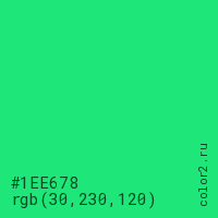 Цвет #1EE678 в цветовой модели RGB обозначается тремя октетами (30, 230, 120) в десятичном формате и #1EE678 в шестнадцатиричном (hex) формате, которые являются интенсивностью красного 30 (hex 1E), интенсивность зелёного 230 (hex E6) и интенсивность синего 120 (hex 78).