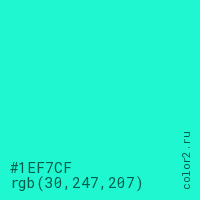 Цвет #1EF7CF в цветовой модели RGB обозначается тремя октетами (30, 247, 207) в десятичном формате и #1EF7CF в шестнадцатиричном (hex) формате, которые являются интенсивностью красного 30 (hex 1E), интенсивность зелёного 247 (hex F7) и интенсивность синего 207 (hex CF).