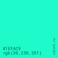 Цвет #1EFAC9 в цветовой модели RGB обозначается тремя октетами (30, 250, 201) в десятичном формате и #1EFAC9 в шестнадцатиричном (hex) формате, которые являются интенсивностью красного 30 (hex 1E), интенсивность зелёного 250 (hex FA) и интенсивность синего 201 (hex C9).