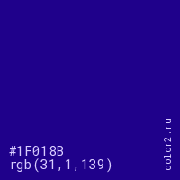 Цвет #1F018B в цветовой модели RGB обозначается тремя октетами (31, 1, 139) в десятичном формате и #1F018B в шестнадцатиричном (hex) формате, которые являются интенсивностью красного 31 (hex 1F), интенсивность зелёного 1 (hex 01) и интенсивность синего 139 (hex 8B).