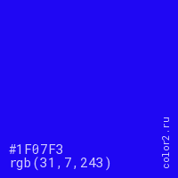 Цвет #1F07F3 в цветовой модели RGB обозначается тремя октетами (31, 7, 243) в десятичном формате и #1F07F3 в шестнадцатиричном (hex) формате, которые являются интенсивностью красного 31 (hex 1F), интенсивность зелёного 7 (hex 07) и интенсивность синего 243 (hex F3).