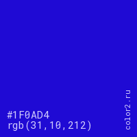 Цвет #1F0AD4 в цветовой модели RGB обозначается тремя октетами (31, 10, 212) в десятичном формате и #1F0AD4 в шестнадцатиричном (hex) формате, которые являются интенсивностью красного 31 (hex 1F), интенсивность зелёного 10 (hex 0A) и интенсивность синего 212 (hex D4).