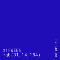 Цвет #1F0EB8 в цветовой модели RGB обозначается тремя октетами (31, 14, 184) в десятичном формате и #1F0EB8 в шестнадцатиричном (hex) формате, которые являются интенсивностью красного 31 (hex 1F), интенсивность зелёного 14 (hex 0E) и интенсивность синего 184 (hex B8).