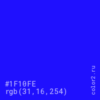 Цвет #1F10FE в цветовой модели RGB обозначается тремя октетами (31, 16, 254) в десятичном формате и #1F10FE в шестнадцатиричном (hex) формате, которые являются интенсивностью красного 31 (hex 1F), интенсивность зелёного 16 (hex 10) и интенсивность синего 254 (hex FE).