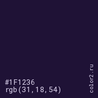 Цвет #1F1236 в цветовой модели RGB обозначается тремя октетами (31, 18, 54) в десятичном формате и #1F1236 в шестнадцатиричном (hex) формате, которые являются интенсивностью красного 31 (hex 1F), интенсивность зелёного 18 (hex 12) и интенсивность синего 54 (hex 36).