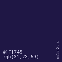 Цвет #1F1745 в цветовой модели RGB обозначается тремя октетами (31, 23, 69) в десятичном формате и #1F1745 в шестнадцатиричном (hex) формате, которые являются интенсивностью красного 31 (hex 1F), интенсивность зелёного 23 (hex 17) и интенсивность синего 69 (hex 45).