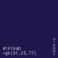 Цвет #1F194D в цветовой модели RGB обозначается тремя октетами (31, 25, 77) в десятичном формате и #1F194D в шестнадцатиричном (hex) формате, которые являются интенсивностью красного 31 (hex 1F), интенсивность зелёного 25 (hex 19) и интенсивность синего 77 (hex 4D).