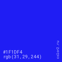 Цвет #1F1DF4 в цветовой модели RGB обозначается тремя октетами (31, 29, 244) в десятичном формате и #1F1DF4 в шестнадцатиричном (hex) формате, которые являются интенсивностью красного 31 (hex 1F), интенсивность зелёного 29 (hex 1D) и интенсивность синего 244 (hex F4).