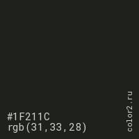 Цвет #1F211C в цветовой модели RGB обозначается тремя октетами (31, 33, 28) в десятичном формате и #1F211C в шестнадцатиричном (hex) формате, которые являются интенсивностью красного 31 (hex 1F), интенсивность зелёного 33 (hex 21) и интенсивность синего 28 (hex 1C).