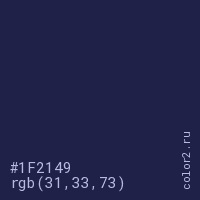 Цвет #1F2149 в цветовой модели RGB обозначается тремя октетами (31, 33, 73) в десятичном формате и #1F2149 в шестнадцатиричном (hex) формате, которые являются интенсивностью красного 31 (hex 1F), интенсивность зелёного 33 (hex 21) и интенсивность синего 73 (hex 49).