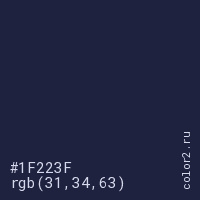 Цвет #1F223F в цветовой модели RGB обозначается тремя октетами (31, 34, 63) в десятичном формате и #1F223F в шестнадцатиричном (hex) формате, которые являются интенсивностью красного 31 (hex 1F), интенсивность зелёного 34 (hex 22) и интенсивность синего 63 (hex 3F).