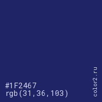 Цвет #1F2467 в цветовой модели RGB обозначается тремя октетами (31, 36, 103) в десятичном формате и #1F2467 в шестнадцатиричном (hex) формате, которые являются интенсивностью красного 31 (hex 1F), интенсивность зелёного 36 (hex 24) и интенсивность синего 103 (hex 67).