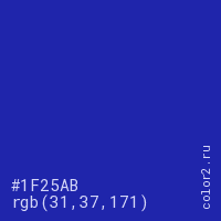 Цвет #1F25AB в цветовой модели RGB обозначается тремя октетами (31, 37, 171) в десятичном формате и #1F25AB в шестнадцатиричном (hex) формате, которые являются интенсивностью красного 31 (hex 1F), интенсивность зелёного 37 (hex 25) и интенсивность синего 171 (hex AB).