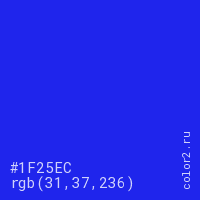 Цвет #1F25EC в цветовой модели RGB обозначается тремя октетами (31, 37, 236) в десятичном формате и #1F25EC в шестнадцатиричном (hex) формате, которые являются интенсивностью красного 31 (hex 1F), интенсивность зелёного 37 (hex 25) и интенсивность синего 236 (hex EC).