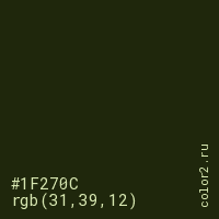 Цвет #1F270C в цветовой модели RGB обозначается тремя октетами (31, 39, 12) в десятичном формате и #1F270C в шестнадцатиричном (hex) формате, которые являются интенсивностью красного 31 (hex 1F), интенсивность зелёного 39 (hex 27) и интенсивность синего 12 (hex 0C).