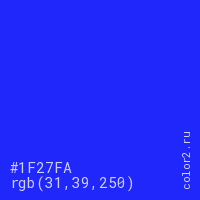 Цвет #1F27FA в цветовой модели RGB обозначается тремя октетами (31, 39, 250) в десятичном формате и #1F27FA в шестнадцатиричном (hex) формате, которые являются интенсивностью красного 31 (hex 1F), интенсивность зелёного 39 (hex 27) и интенсивность синего 250 (hex FA).