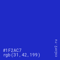 Цвет #1F2AC7 в цветовой модели RGB обозначается тремя октетами (31, 42, 199) в десятичном формате и #1F2AC7 в шестнадцатиричном (hex) формате, которые являются интенсивностью красного 31 (hex 1F), интенсивность зелёного 42 (hex 2A) и интенсивность синего 199 (hex C7).