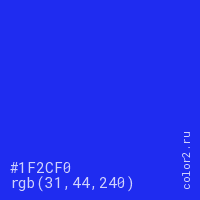 Цвет #1F2CF0 в цветовой модели RGB обозначается тремя октетами (31, 44, 240) в десятичном формате и #1F2CF0 в шестнадцатиричном (hex) формате, которые являются интенсивностью красного 31 (hex 1F), интенсивность зелёного 44 (hex 2C) и интенсивность синего 240 (hex F0).