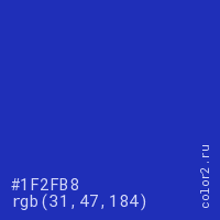 Цвет #1F2FB8 в цветовой модели RGB обозначается тремя октетами (31, 47, 184) в десятичном формате и #1F2FB8 в шестнадцатиричном (hex) формате, которые являются интенсивностью красного 31 (hex 1F), интенсивность зелёного 47 (hex 2F) и интенсивность синего 184 (hex B8).