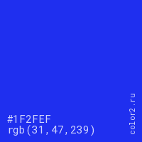 Цвет #1F2FEF в цветовой модели RGB обозначается тремя октетами (31, 47, 239) в десятичном формате и #1F2FEF в шестнадцатиричном (hex) формате, которые являются интенсивностью красного 31 (hex 1F), интенсивность зелёного 47 (hex 2F) и интенсивность синего 239 (hex EF).