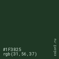 Цвет #1F3825 в цветовой модели RGB обозначается тремя октетами (31, 56, 37) в десятичном формате и #1F3825 в шестнадцатиричном (hex) формате, которые являются интенсивностью красного 31 (hex 1F), интенсивность зелёного 56 (hex 38) и интенсивность синего 37 (hex 25).