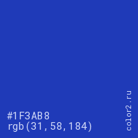 Цвет #1F3AB8 в цветовой модели RGB обозначается тремя октетами (31, 58, 184) в десятичном формате и #1F3AB8 в шестнадцатиричном (hex) формате, которые являются интенсивностью красного 31 (hex 1F), интенсивность зелёного 58 (hex 3A) и интенсивность синего 184 (hex B8).