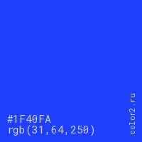 Цвет #1F40FA в цветовой модели RGB обозначается тремя октетами (31, 64, 250) в десятичном формате и #1F40FA в шестнадцатиричном (hex) формате, которые являются интенсивностью красного 31 (hex 1F), интенсивность зелёного 64 (hex 40) и интенсивность синего 250 (hex FA).