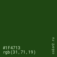 Цвет #1F4713 в цветовой модели RGB обозначается тремя октетами (31, 71, 19) в десятичном формате и #1F4713 в шестнадцатиричном (hex) формате, которые являются интенсивностью красного 31 (hex 1F), интенсивность зелёного 71 (hex 47) и интенсивность синего 19 (hex 13).