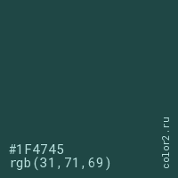 Цвет #1F4745 в цветовой модели RGB обозначается тремя октетами (31, 71, 69) в десятичном формате и #1F4745 в шестнадцатиричном (hex) формате, которые являются интенсивностью красного 31 (hex 1F), интенсивность зелёного 71 (hex 47) и интенсивность синего 69 (hex 45).
