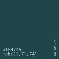 Цвет #1F474A в цветовой модели RGB обозначается тремя октетами (31, 71, 74) в десятичном формате и #1F474A в шестнадцатиричном (hex) формате, которые являются интенсивностью красного 31 (hex 1F), интенсивность зелёного 71 (hex 47) и интенсивность синего 74 (hex 4A).